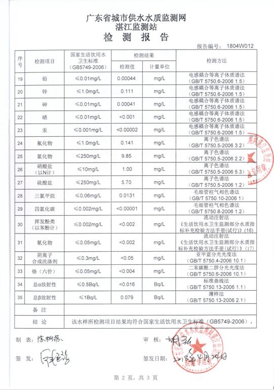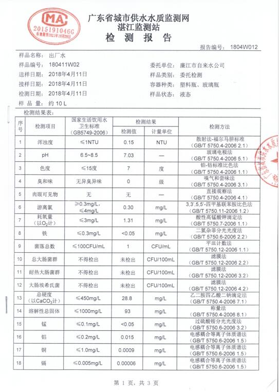 廉江市自來水有限公司出廠水檢驗數(shù)據(jù)(