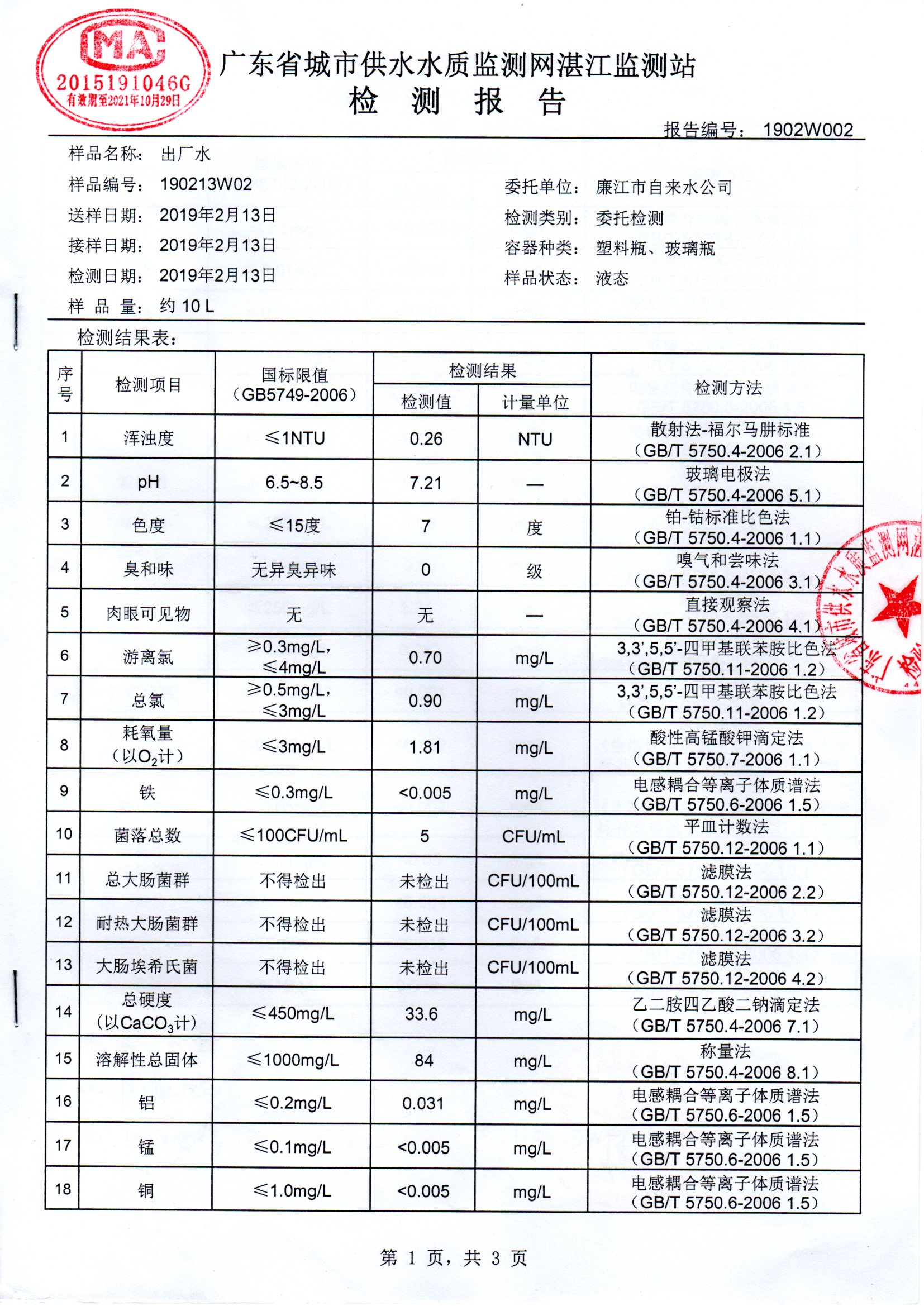 廉江市自來水有限公司出廠水檢驗(yàn)數(shù)據(jù)(