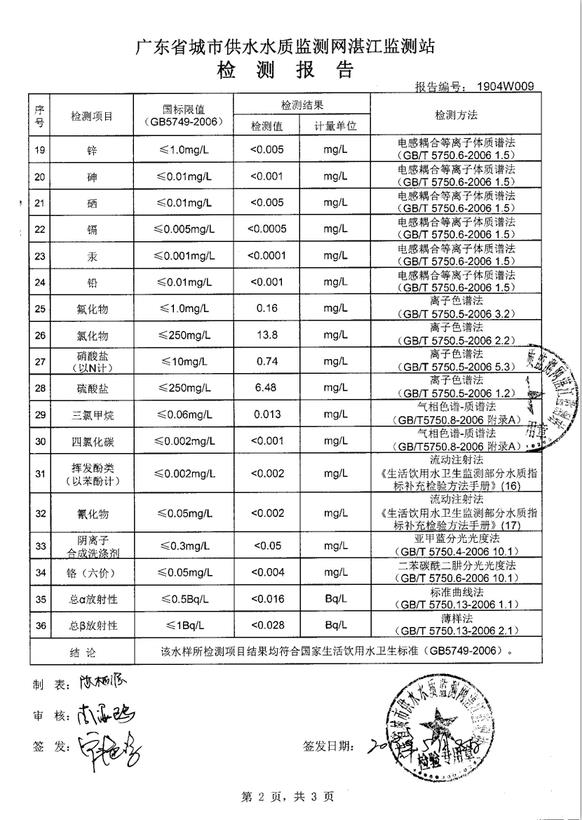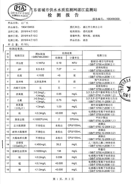 廣東省城市供水水質(zhì)監(jiān)測網(wǎng)湛江監(jiān)測站檢測報告 2019年4月份
